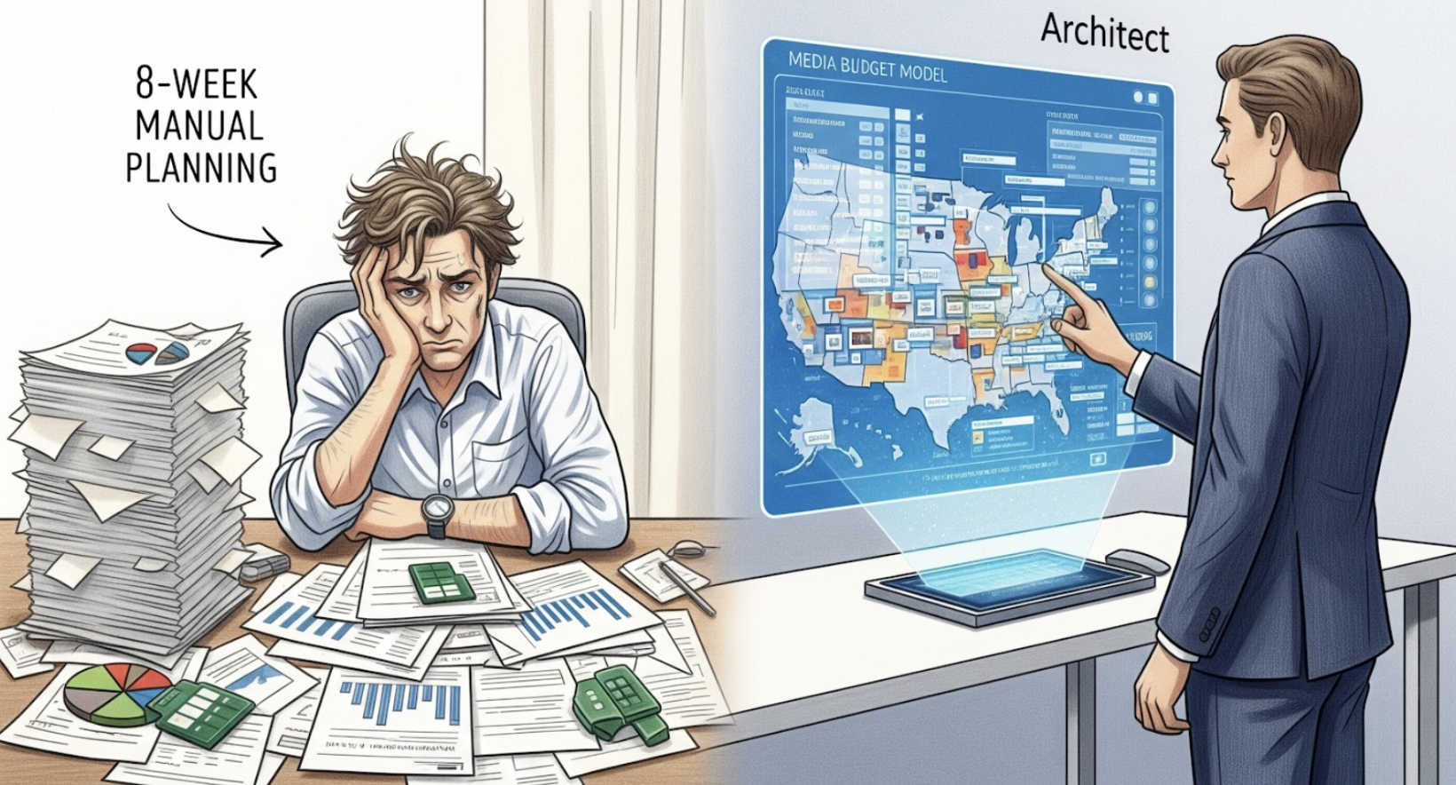 - Modeling: Media buyers manually input data into Excel to build budget allocation models—a process rife with "Excel fatigue" and version control errors.